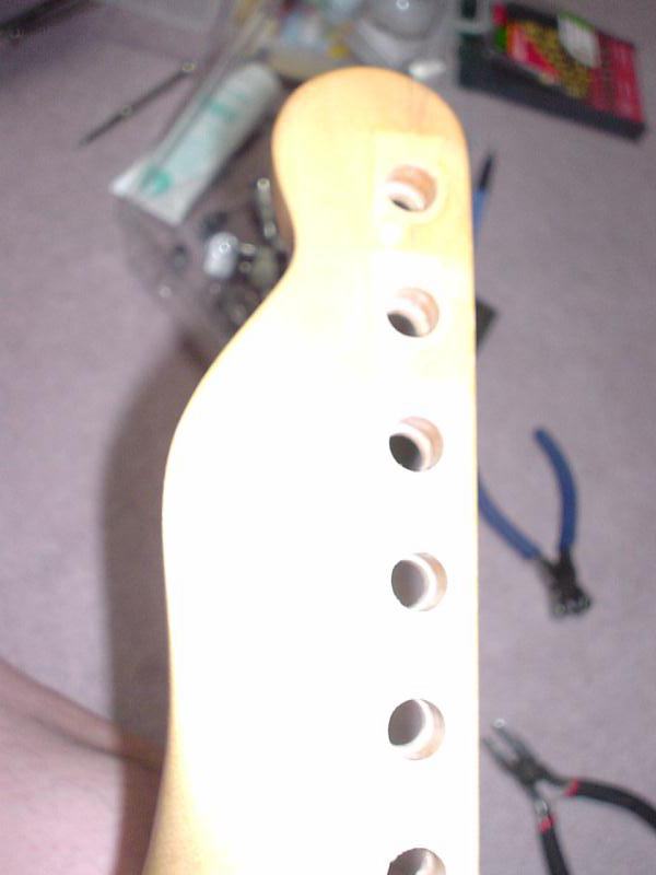 2003.8.12 スパーゼル正面の糸巻き 穴径は9mmから10mmに変更したため ちょっとラッカーごと割れたり ささくれたりしました。失敗。 丸い筒のヤスリを掛けるべき |
